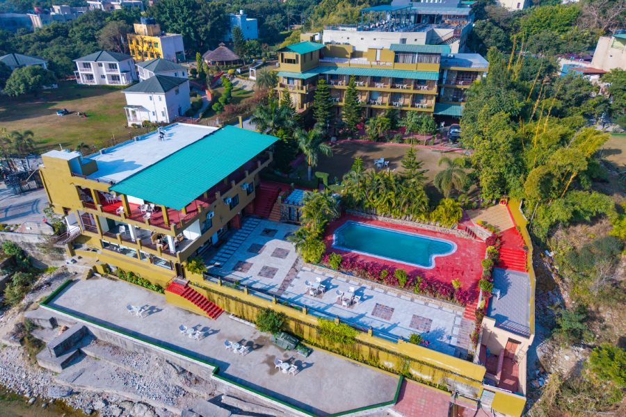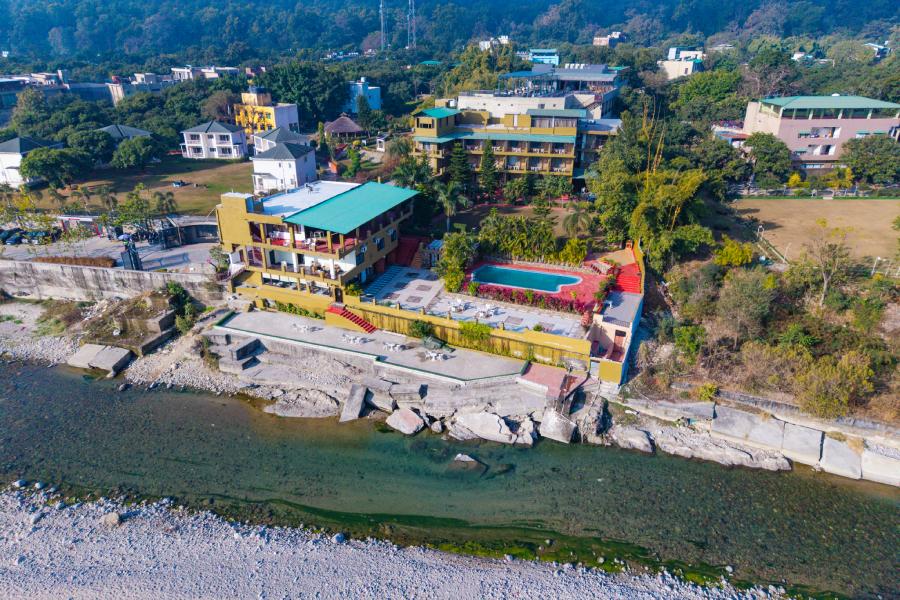 Set on the banks of the Kosi River in Dhikuli, the resort offers rare direct access to the river, allowing guests to experience the water up close rather than from a distance. Turquoise currents flow past a riverside deck where a large swimming pool meets uninterrupted views, while the resort’s 30 rooms are designed around the river, almost all are river-facing, and those that are not open onto a common gallery that leads to a space directly above the water, furnished with sofas for quiet moments spent watching the river pass by.